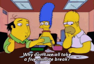 Why don't we all take a five-minute break? It'll clear our heads. Good idea, Marge. My mind is going a mile a minute.