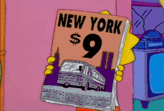 Nine bucks? This one's on me! Great! We're all going to New York! Lousy Bart and his money. All right, New York, I'm comin' back!