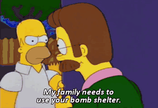 My family needs to use your bomb shelter. Homer! I kinda figured this might happen. So I built the shelter big enough for both our families. No deal. Out. Get in the shelter, Homer.