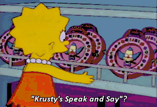 "Krusty's Speak and Say"? "S" is for shiksa. S-H-i-- Mmm-- I think there's a "T" in there somewhere. Ah, look it up. Lisa! Stay cool, Milly.