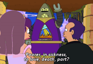 Poorer, in sickness, to love, death, part? Yeah, sure, I do. Come on-- faster! Do you, Leela, copy and paste his response till death do you part? I... d--