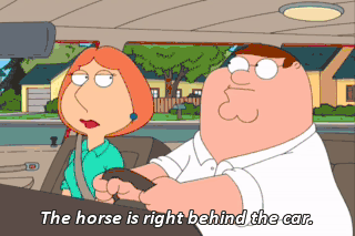 The horse is right behind the car. Peter, that thing is just creepy. Hey, scat, scat. Go on, you. We're going to see a movie. All right, I'm gonna try something else. (TIRES SCREECHING) (HONKING)