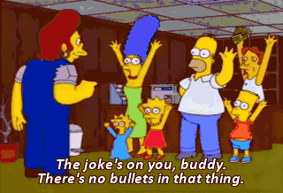 The joke's on you, buddy. There's no bullets in that thing. Yo, give me the bullets. Okay. Don't shoot! Drop it! Bye! How did you know we were being robbed?