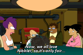 Now, we all love Nibbler, so it's only fair... that we all pitch in and clean it up together. Still, I propose we make Zoidberg do it. All in favor? All opposed?