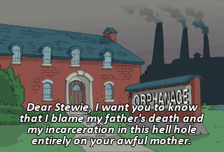 Dear Stewie, I want you to know that I blame my father's death and my incarceration in this hell hole entirely on your awful mother.