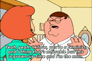 Yeah, yeah. I know, you're a feminist, and I think that's adorable but this is grown-up time and I'm the man.