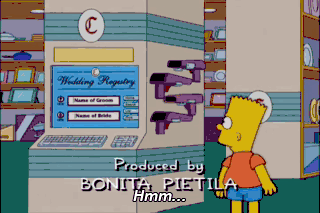 Hmm... "Name of groom," Bart Simpson. "Name of bride," Lotta Cooties. (LAUGHING MALICIOUSLY) (BEEPS) (WHITE WEDDING PLAYING) It's a nice day for a white wedding