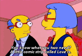 You know what you two need? A little comic strip called Love Is. It's about two naked eight-year-olds who are married. Mmm! Well, Marge, if that was my last meal,