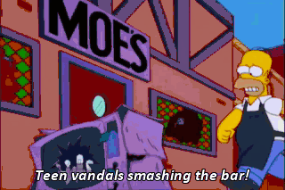 Teen vandals smashing the bar! Moe's gonna kill me! Hey, Homer.