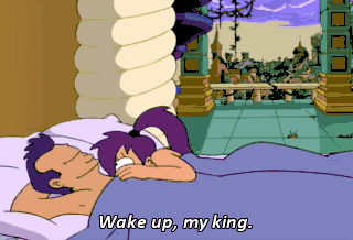 Wake up, my king. Oh, geez, what a night. Make me some coffee, would ya? Uh, sure. Okay.