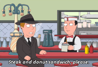 Steak and donut sandwich, please. You want cigarettes on that sandwich? What do I look like, a Mary? Yes, I want cigarettes.