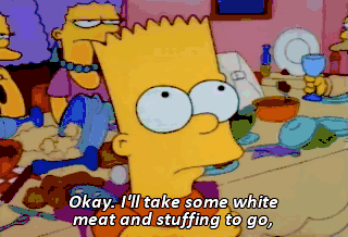 Okay. I'll take some white meat and stuffing to go, and send up the pumpkin pie in about 20 minutes. I said now ! Mom, do I have to ? Yes, you do ! I hope you're happy, Bart !
