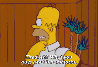 Tired, eh? What you guys need is hammocks. Uh, hi, Homer. What can I do for you? Sir, I need to know where I can get some business hammocks. Hammocks? My goodness, what an idea.