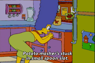 Potato masher's stuck in small spoon slot. What kinda madman would do that? (GRUNTING) (GRUNTS) (GASPS) Ooh. Bart! Honey, I'm so sorry! No problem.