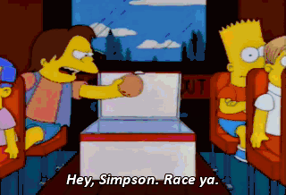 Hey, Simpson. Race ya. First one to the front of the bus gets Martin's lunch money. What? Go apple! Go orange! Go banana!