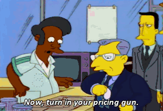 Now, turn in your pricing gun. Oh! The other one too. Oh! Fired after all these years of loyal service.