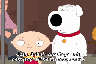 Gosh, Brian! I sure hope this next leap will be the leap home. Wait! Take me with you. What do you mean? You can't go back to our universe.