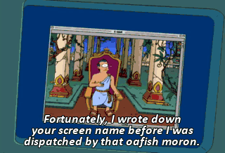 Fortunately, I wrote down your screen name before I was dispatched by that oafish moron.