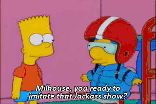 Milhouse, you ready to imitate that Jackass show? All those disclaimers made me wanna do it more. Oh, yeah