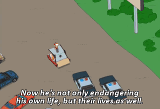 Now he's not only endangering his own life, but their lives as well. The driver totals the car and makes a run for it, but the pursuing officers are prepared. Running from the cops? Yabba-dabba-don't!