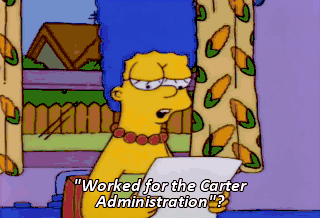 "Worked for the Carter Administration"? Well, you voted for him... twice! Lisa, shh! Someone might be listening. Mm-hmm. Uh-huh.