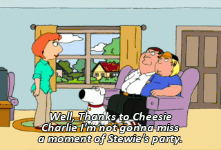 Well, Thanks to Cheesie Charlie I'm not gonna miss a moment of Stewie's party. I say, am I to spend the entire day wallowing around in my own feces? A little service here! Hey, Stinky.