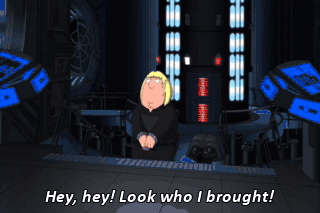 Hey, hey! Look who I brought! Welcome, young Skywalker. Thank you. Not you! I'm so embarrassed.