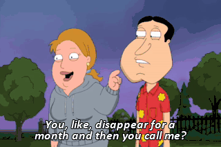 You, like, disappear for a month and then you call me? So silly! You're lucky I like you so much. Okay, why don't you go ahead and take the bags in?