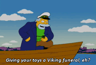 Giving your toys a Viking funeral, eh? I really don't want to talk about it. If you change your mind, I won't be far. Thanks, but...