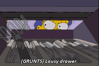 (GRUNTS) Lousy drawer. Potato masher's stuck in small spoon slot. What kinda madman would do that? (GRUNTING) (GRUNTS) (GASPS) Ooh. Bart! Honey, I'm so sorry! No problem.