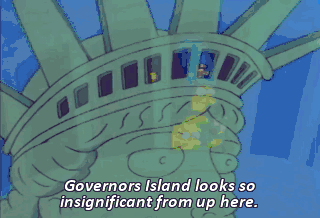 Governors Island looks so insignificant from up here. Hey, immigrants, beat it! Country's full! Okay, folks. You heard the lady. Back into the hold. We'll try Canada.