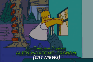 - (CAT MEWS) - (GRUNTS) Homer, what are you doing? Trying to get a Frisbee off the roof. (GRUNTS) Ow! Oh, there's the Frisbee. (CHUCKLES) (GROANS) Concussion-diddily... Hemorrhage-doodily...