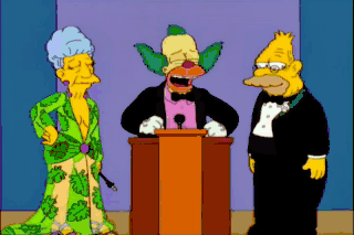 Grampa Simpson and Agnes Skinner! Sweet Toledo! What's keeping that dress on? The collective will of everyone in this room! Ha-ha! Excellent. You fruits wouldn't know what to do with me!