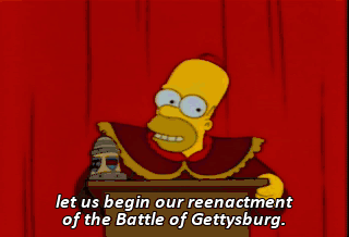 let us begin our reenactment of the Battle of Gettysburg. Homer, you can't just keep hanging out with these colobus monkeys. Somebody's gonna get parasites. Oh, Marge, kids, I miss my club. Oh, Homie.