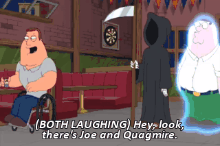 (BOTH LAUGHING) Hey, look, there's Joe and Quagmire.