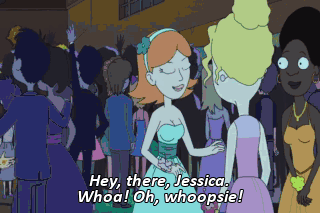Hey, there, Jessica. Whoa! Oh, whoopsie! Oh, my god, Morty. You look really nice tonight. Wow, thanks. I love you, Marty! I love you so much it burns!