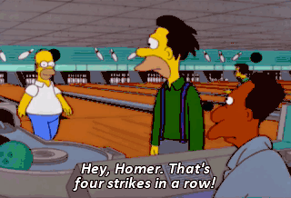 Hey, Homer. That's four strikes in a row! - You got a perfect game going. - Really?