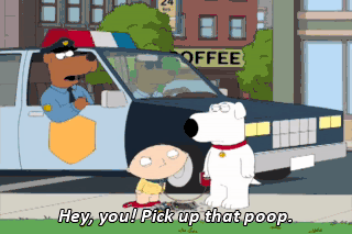 Hey, you! Pick up that poop. You heard him, Brian. Pick up my poop. Go on. Pick it up. Do it. Pick up my poop! I need a plastic bag. Here's a thin napkin.