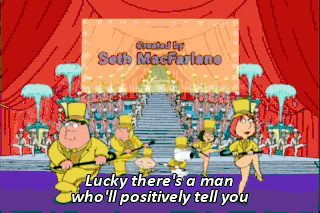 Lucky there's a man who'll positively tell you all the things that make us laugh 'n' cry He's a family guy What in the name of our Christian God? You're out of the semicircle!