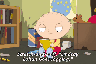 Scratch-and-sniff. "Lindsay Lohan Goes Jogging." (SCRATCHING) (SNIFFS) Oh, God! That's terrible! Oh, here's a pop-up book. "Tommy Lee Goes Boating."