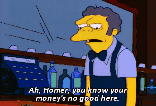 Ah, Homer, you know your money's no good here. Hey, wait a minute. This is real money. Yeah. My wife is rakin' it in.