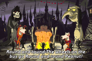 Round and round The wheels on the bus go Round and round Peanut! All through the town (VOCALIZING) (EERILY) Peeper...