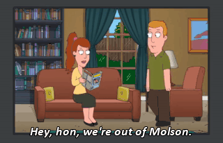 Hey, hon, we're out of Molson. Oh, not to worry. We've got some Labatt's in the garage. And could you get one for the ghost?