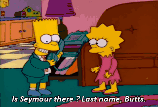 Is Seymour there ? Last name, Butts. just a sec. Hey, is there a Butts here ? Seymour Butts ? Hey, everybody, I want a Seymour Butts !