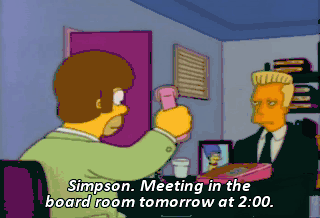 Simpson. Meeting in the board room tomorrow at 2:00. just sit there and keep your mouth shut. Got it ? Yes, Mr. Smithers. He thinks he's so big.