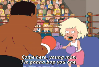 Come here, young man. I'm gonna bop you one. (CROWD CHEERING) - She's getting beat! - No, she's getting mad. You ain't so tough, young man. That all you got, you son ofa bitch? You're going down, young man.
