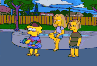 Hmm. Hey, Bart! Lisa's skateboarding with some cool kids. And she looks like Blossom. Lisa? With people? If they're impressed by her, I'm gonna Bart their world. Okay, Milhouse, you know the drill.