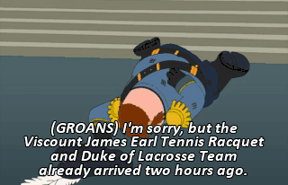 (GROANS) I'm sorry, but the Viscount James Earl Tennis Racquet and Duke of Lacrosse Team already arrived two hours ago. But that's impossible!