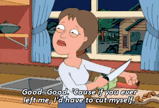 Good. Good. 'Cause if you ever left me, I'd have to cut myself. And then I'd cut you. I love you, Glenn. I love you, too, insane-woman-I'm-having- second-thoughts-about. What? All right.