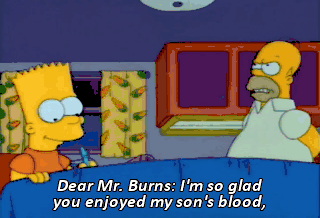 Dear Mr. Burns: I'm so glad you enjoyed my son's blood, and your card was just great. In case you can't tell, I'm being sarcastic.